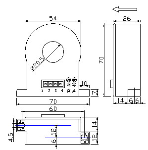 外形结构及安装图: 接线方法 当原边电流沿传感器箭头方向流动时,在输出端获得同相电压。